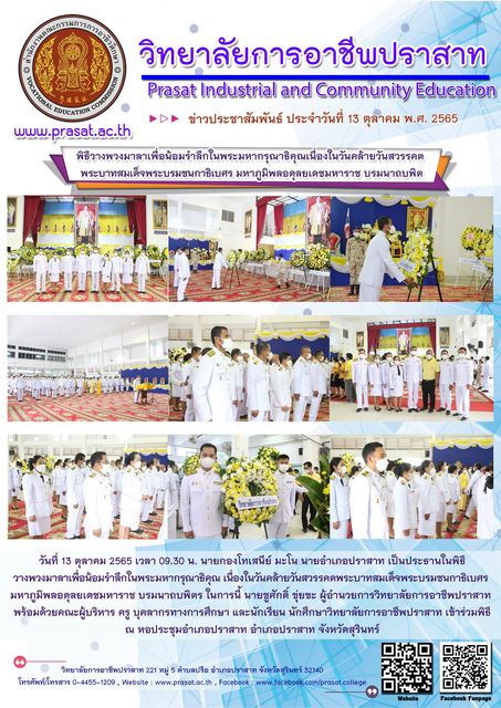 ข่าวประชาสัมพันธ์ภาพกิจกรรมร่วมกับชุมชน พิธีถวายพวงมาลาเพื่อน้อมรำลึกในพระมหากรุณาธิคุณ รัชกาลที่9 03/01/2023 Sasiprapa Maiprom 539 Views พิธีถวายพวงมาลาเพื่อน้อมรำลึกในพระมหากรุณาธิคุณ รัชกาลที่ 9 วันที่ 13 ตุลาคม 2565 เวลา 09.30 น. นายกองโทเสนีย์ มะโน นายอำเภอปราสาท เป็นประธานในพิธีวางพวงมาลาเพื่อน้อมรำลึกในพระมหากรุณาธิคุณ เนื่องในวันคล้ายวันสวรรคตพระบาทสมเด็จพระบรมชนกาธิเบศร มหาภูมิพลอดุลยเดชมหาราช บรมนาถบพิตร ในการนี้ นายชูศักดิ์ ขุ่ยขะ ผู้อำนวยการวิทยาลัยการอาชีพปราสาท พร้อมด้วยคณะผู้บริหาร ครู บุคลากรทางการศึกษา และนักเรียน นักศึกษาวิทยาลัยการอาชีพปราสาท เข้าร่วมพิธี ณ หอประชุมอำเภอปราสาท อำเภอปราสาท จังหวัดสุรินทร์ อ่านเพิ่มเติมได้ที่…