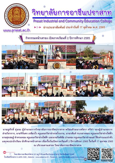 ข่าวประชาสัมพันธ์ภาพกิจกรรมภายในสถานศึกษา กิจกรรมหน้าเสาธง เปิดภาคเรียนที่ 2 ปีการศึกษา 2565 03/01/2023 Sasiprapa Maiprom 569 Views กิจกรรมหน้าเสาธง เปิดภาคเรียนที่ 2 ปีการศึกษา 2565 นายชูศักดิ์ ขุ่ยขะ ผู้อำนวยการวิทยาลัยการอาชีพปราสาท พร้อมด้วยนางพัชรา ศรีคำ รองผู้อำนวยการฝ่ายวิชาการ, นายจิรันดร เฉลียวไว ครูแผนกวิชาช่างกลโรงงาน, นายวสันต์ กบกลางดอน ครูแผนกวิชาช่างไฟฟ้า, นายสุรเชษฐ์ ลำดวนหอม ครูแผนกวิชาช่างไฟฟ้า และนายกิตติชัย ปานทอง ครูแผนกวิชาช่างยนต์ ได้กล่าวแนะนำตัว และพบปะนักเรียน นักศึกษาหน้าเสาธง เนื่องในวันเปิดภาคเรียนที่ 2 ปีการศึกษา 2565 ในวันที่ 17 ตุลาคม 2565 ณ บริเวณลานเสาธง วิทยาลัยการอาชีพปราสาท อ่านเพิ่มเติมได้ที่….
