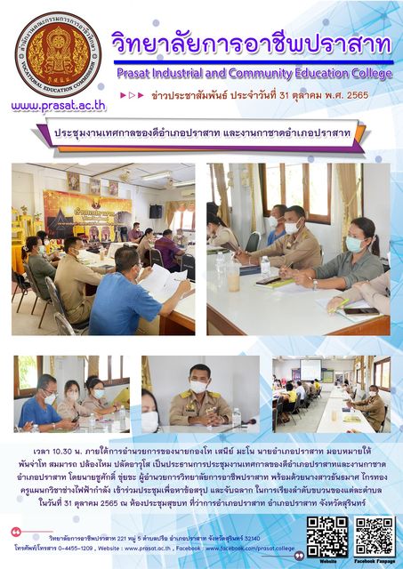 ข่าวประชาสัมพันธ์ภาพกิจกรรมร่วมกับชุมชน ประชุมงานเทศกาลของดีอำเภอปราสาทและงานกาชาด อำเภอปราสาท 09/01/2023 Sasiprapa Maiprom 602 Views ประชุมงานเทศกาลของดีอำเภอปราสาทและงานกาชาด อำเภอปราสาท เวลา 10.30 น. ภายใต้การอำนวยการของนายกองโท เสนีย์ มะโน นายอำเภอปราสาท มอบหมายให้ พันจ่าโท สมมารถ ปล้องไหม ปลัดอาวุโส เป็นประธานการประชุมงานเทศกาลของดีอำเภอปราสาทและงานกาชาด อำเภอปราสาท โดยนายชูศักดิ์ ขุ่ยขะ ผู้อำนวยการวิทยาลัยการอาชีพปราสาท พร้อมด้วยนางสาวธันธมาศ ไกรทอง ครูแผนกวิชาช่างไฟฟ้ากำลัง เข้าร่วมประชุมเพื่อหาข้อสรุป และจับฉลาก ในการเรียงลำดับขบวนของแต่ละตำบล ในวันที่ 31 ตุลาคม 2565 ณ ห้องประชุมสุขบท ที่ว่าการอำเภอปราสาท อำเภอปราสาท จังหวัดสุรินทร์ อ่านเพิ่มเติมได้ที่…