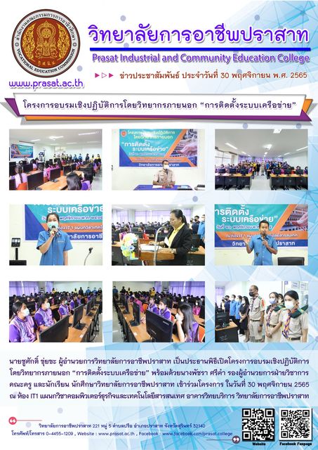 ข่าวประชาสัมพันธ์ภาพกิจกรรมภายในสถานศึกษา โครงการอบรมฯ “การติดตั้งระบบเครือข่าย” 11/01/2023 Sasiprapa Maiprom 468 Views โครงการอบรมฯ “การติดตั้งระบบเครือข่าย" นายชูศักดิ์ ขุ่ยขะ ผู้อำนวยการวิทยาลัยการอาชีพปราสาท เป็นประธานพิธีเปิดโครงการอบรมเชิงปฏิบัติการโดยวิทยากรภายนอก “การติดตั้งระบบเครือข่าย” พร้อมด้วยนางพัชรา ศรีคำ รองผู้อำนวยการฝ่ายวิชาการ คณะครู และนักเรียน นักศึกษาวิทยาลัยการอาชีพปราสาท เข้าร่วมโครงการ ในวันที่ 30 พฤศจิกายน 2565 ณ ห้อง IT1 แผนกวิชาคอมพิวเตอร์ธุรกิจและเทคโนโลยีสารสนเทศ อาคารวิทยบริการ วิทยาลัยการอาชีพปราสาท อ่านเพิ่มเติมได้ที่….