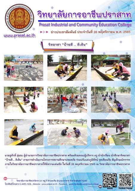 ข่าวประชาสัมพันธ์ภาพกิจกรรมภายในสถานศึกษา จิตอาสา “ป้ายสี .. ตีเส้น” 11/01/2023 Sasiprapa Maiprom 736 Views จิตอาสา “ป้ายสี .. ตีเส้น” นายชูศักดิ์ ขุ่ยขะ ผู้อำนวยการวิทยาลัยการอาชีพปราสาท พร้อมด้วยคณะผู้บริหาร ครู นำนักเรียน นักศึกษาจิตอาสา “ป้ายสี .. ตีเส้น” ภายการดำเนินงานโครงการสถานศึกษาปลอดภัย ร่วมปรับแต่งภูมิทัศน์ จุดเตือนภัย สัญลักษณ์จราจรmภายในวิทยาลัยการอาชีพปราสาทให้มีความเด่นชัด ในวันที่ 26 พฤศจิกายน 2565 ณ วิทยาลัยการอาชีพปราสาท อ่านเพิ่มเติมได้ที่..