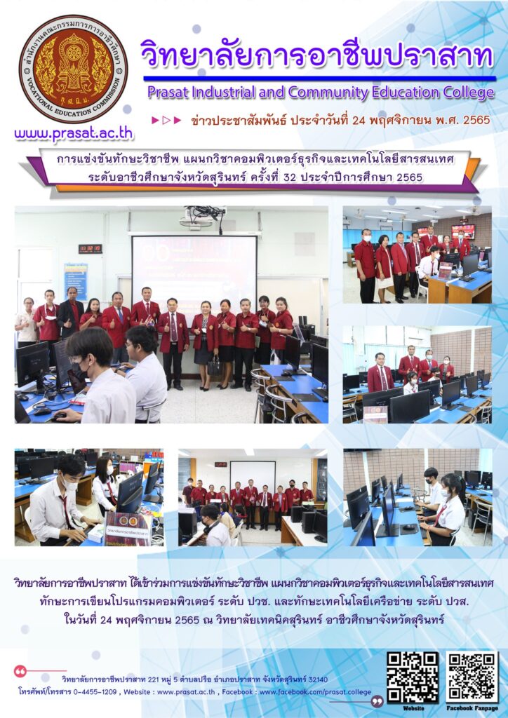 ข่าวประชาสัมพันธ์ภาพกิจกรรมร่วมกับชุมชน แข่งขันทักษะ เทคโนโลยีสารสนเทศ ระดับ อศจ.สุรินทร์ 2565 26/01/2023 Sasiprapa Maiprom 482 Views แข่งขันทักษะ เทคโนโลยีสารสนเทศ ระดับ อศจ.สุรินทร์ 2565 วิทยาลัยการอาชีพปราสาท ได้เข้าร่วมการแข่งขันทักษะวิชาชีพ แผนกวิชาคอมพิวเตอร์ธุรกิจและเทคโนโลยีสารสนเทศ ทักษะการเขียนโปรแกรมคอมพิวเตอร์ ระดับ ปวช. และทักษะเทคโนโลยีเครือข่าย ระดับ ปวส. ในวันที่ 24 พฤศจิกายน 2565 ณ วิทยาลัยเทคนิคสุรินทร์ อาชีวศึกษาจังหวัดสุรินทร์ อ่านเพิ่มเติมได้ที่..
