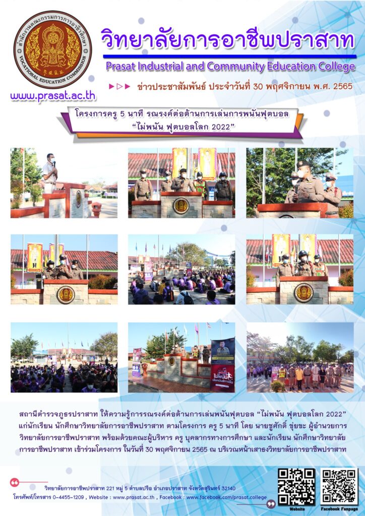 ข่าวประชาสัมพันธ์ภาพกิจกรรมภายในสถานศึกษา โครงการครู 5 นาที รณรงค์ต่อต้านการเล่นการพนันฟุตบอล 26/01/2023 Sasiprapa Maiprom 745 Views โครงการครู 5 นาที รณรงค์ต่อต้านการเล่นการพนันฟุตบอล สถานีตำรวจภูธรปราสาท ให้ความรู้การรณรงค์ต่อต้านการเล่นพนันฟุตบอล “ไม่พนัน ฟุตบอลโลก 2022” แก่นักเรียน นักศึกษาวิทยาลัยการอาชีพปราสาท ตามโครงการ ครู 5 นาที โดย นายชูศักดิ์ ขุ่ยขะ ผู้อำนวยการวิทยาลัยการอาชีพปราสาท พร้อมด้วยคณะผู้บริหาร ครู บุคลากรทางการศึกษา และนักเรียน นักศึกษาวิทยาลัยการอาชีพปราสาท เข้าร่วมโครงการ ในวันที่ 30 พฤศจิกายน 2565 ณ บริเวณหน้าเสาธงวิทยาลัยการอาชีพปราสาท อ่านเพิ่มเติมได้ที่…