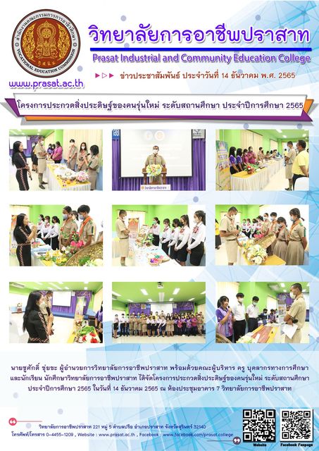 ข่าวประชาสัมพันธ์ภาพกิจกรรมภายในสถานศึกษา โครงการประกวดสิ่งประดิษฐ์ของคนรุ่นใหม่ ระดับสถานศึกษา 31/01/2023 Sasiprapa Maiprom 463 Views โครงการประกวดสิ่งประดิษฐ์ของคนรุ่นใหม่ ระดับสถานศึกษา นายชูศักดิ์ ขุ่ยขะ ผู้อำนวยการวิทยาลัยการอาชีพปราสาท พร้อมด้วยคณะผู้บริหาร ครู บุคลากรทางการศึกษา และนักเรียน นักศึกษาวิทยาลัยการอาชีพปราสาท ได้จัดโครงการประกวดสิ่งประดิษฐ์ของคนรุ่นใหม่ ระดับสถานศึกษา ประจำปีการศึกษา 2565 ในวันที่ 14 ธันวาคม 2565 ณ ห้องประชุมอาคาร 7 วิทยาลัยการอาชีพปราสาท อ่านเพิ่มเติมได้ที่…