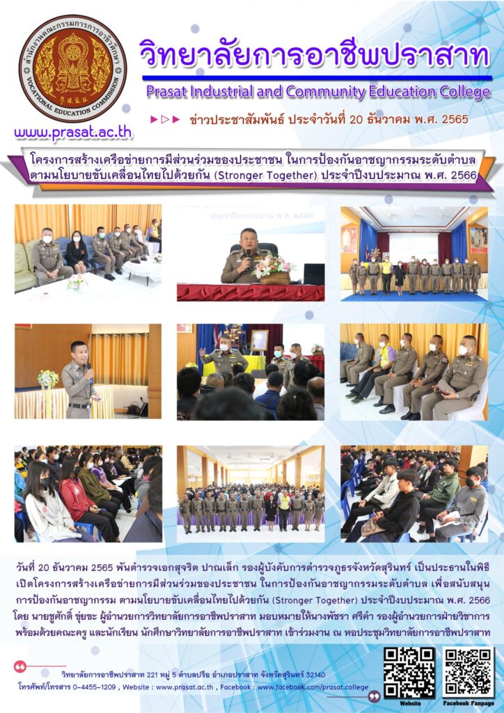 ข่าวประชาสัมพันธ์ภาพกิจกรรมภายในสถานศึกษา โครงการสร้างเครือข่ายการมีส่วนร่วมของประชาชนฯ 31/01/2023 Sasiprapa Maiprom 450 Views โครงการสร้างเครือข่ายการมีส่วนร่วมของประชาชนฯ วันที่ 20 ธันวาคม 2565 พันตำรวจเอกสุจริต ปาณเล็ก รองผู้บังคับการตำรวจภูธรจังหวัดสุรินทร์ เป็นประธานในพิธีเปิดโครงการสร้างเครือข่ายการมีส่วนร่วมของประชาชน ในการป้องกันอาชญากรรมระดับตำบล เพื่อสนับสนุนการป้องกันอาชญากรรม ตามนโยบายขับเคลื่อนไทยไปด้วยกัน (Stronger Together) ประจำปีงบประมาณ พ.ศ. 2566 โดย นายชูศักดิ์ ขุ่ยขะ ผู้อำนวยการวิทยาลัยการอาชีพปราสาท มอบหมายให้นางพัชรา ศรีคำ รองผู้อำนวยการฝ่ายวิชาการ พร้อมด้วยคณะครู และนักเรียน นักศึกษาวิทยาลัยการอาชีพปราสาท เข้าร่วมงาน ณ หอประชุมวิทยาลัยการอาชีพปราสาท อ่านเพิ่มเติมได้ที่…