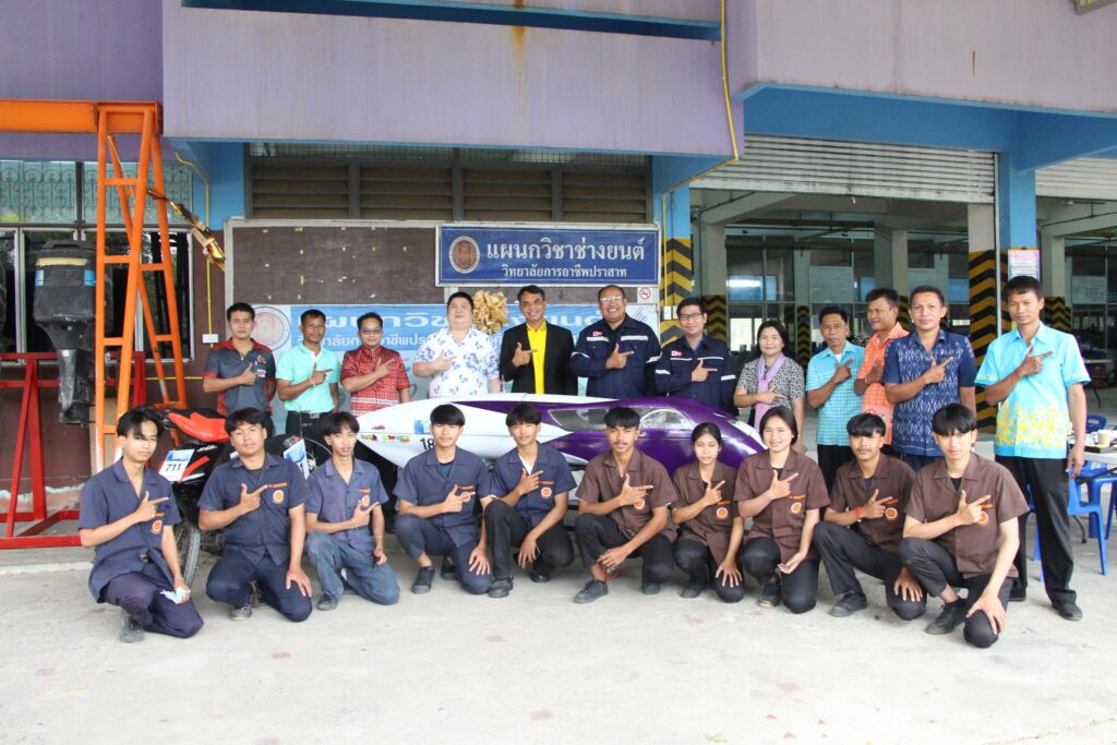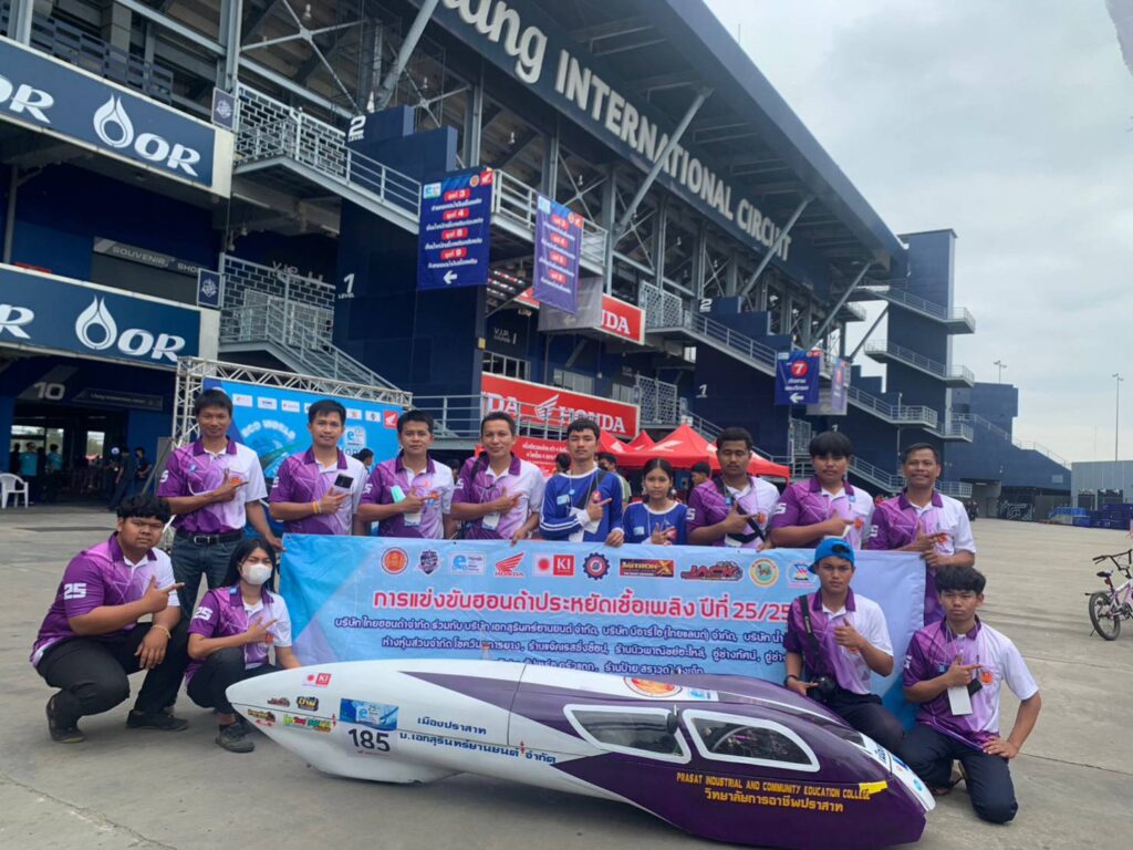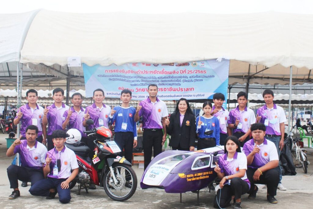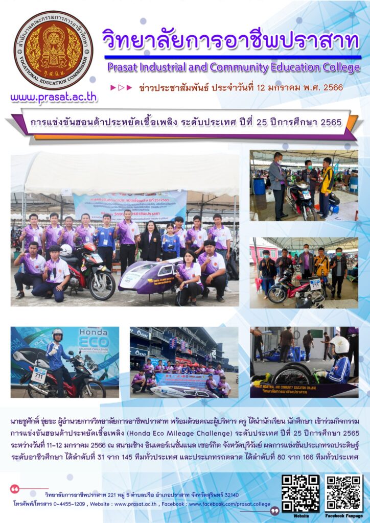 ข่าวประชาสัมพันธ์ภาพกิจกรรมภายในสถานศึกษา การแข่งขันฮอนด้าประหยัดเชื้อเพลิง ระดับประเทศ ปีที่ 25 14/03/2023 Sasiprapa Maiprom 427 Views การแข่งขันฮอนด้าประหยัดเชื้อเพลิง ระดับประเทศ ปีที่ 25 นายชูศักดิ์ ขุ่ยขะ ผู้อำนวยการวิทยาลัยการอาชีพปราสาท พร้อมด้วยคณะผู้บริหาร ครู ได้นำนักเรียน นักศึกษา เข้าร่วมกิจกรรมการแข่งขันฮอนด้าประหยัดเชื้อเพลิง (Honda Eco Mileage Challenge) ระดับประเทศ ปีที่ 25 ปีการศึกษา 2565 ระหว่างวันที่ 11-12 มกราคม 2566 ณ สนามช้าง อินเตอร์เนชั่นแนล เซอร์กิต จังหวัดบุรีรัมย์ ผลการแข่งขันประเภทรถประดิษฐ์ ระดับอาชีวศึกษา ได้ลำดับที่ 31 จาก 145 ทีมทั่วประเทศ และประเภทรถตลาด ได้ลำดับที่ 80 จาก 166 ทีมทั่วประเทศ ขอขอบคุณผู้ให้การสนับสนุนทุกๆท่าน 🙏บริษัทไทยฮอนด้าจำกัด 🙏บริษัทเอกสุรินทร์ยานยนต์ จำกัด 🙏บริษัท บีอาร์ไอ(ไทยแลนด์)จำกัด 🙏บริษัท น้ำตาลสุรินทร์ จำกัด 🙏ห้างหุ้นส่วนจำกัด โชควิมลการยาง 🙏ร้านแจ๊คเรสซิ่งช็อป 🙏ร้านนิวพาณิชย์อะไหล่ 🙏อู่ช่างทัศน์ 🙏อู่ช่างหงา 🙏YouTube สัปเหร่อ ครัวแตก 🙏ร้านป้าย สราวุฒิ อิงเจ็ท อ่านเพิ่มเติมได้ที่…
