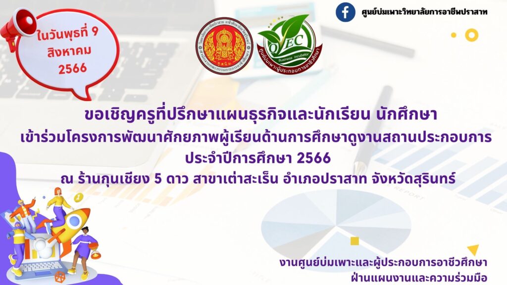 ข่าวประชาสัมพันธ์ข่าวสารและประกาศวิทยาลัยฯ ขอเชิญเข้าร่วม โครงการพัฒนาศักยภาพผู้เรียนด้านการศึกษาดูงานสถานประกอบการ ประจำปีการศึกษา 2566 วันพุธที่ 9 เดือนสิงหาคม พ.ศ. 2566 ณ ร้านกุนเชียง 5 ดาว สาขาเต่าซะเร็น อำเภอปราสาท จังหวัดสุ 07/08/2023 Sasiprapa Maiprom 533 Views