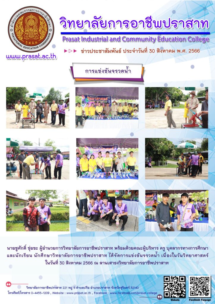 ภาพกิจกรรมภายในสถานศึกษา การแข่งขันจรวดน้ำ 18/09/2023 Sasiprapa Maiprom 654 Views การแข่งขันจรวดน้ำ นายชูศักดิ์ ขุ่ยขะ ผู้อำนวยการวิทยาลัยการอาชีพปราสาท พร้อมด้วยคณะผู้บริหาร ครู บุคลากรทางการศึกษา และนักเรียน นักศึกษาวิทยาลัยการอาชีพปราสาท ได้จัดการแข่งขันจรวดน้ำ เนื่องในวันวิทยาศาสตร์ ในวันที่ 30 สิงหาคม 2566 ณ ลานเสาธงวิทยาลัยการอาชีพปราสาท อ่านเพิ่มเติมได้ที่…