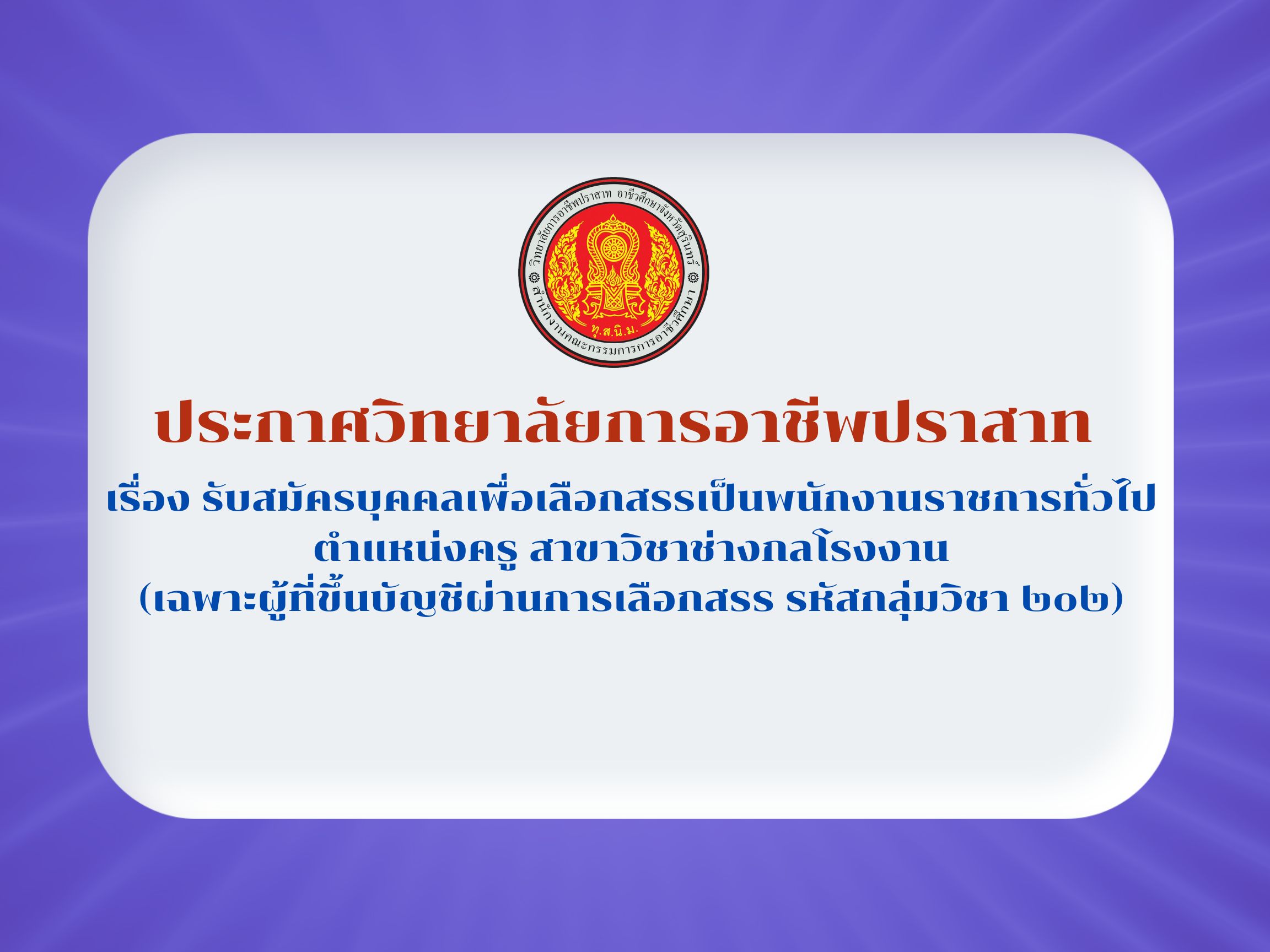 ประกาศวิทยาลัยการอาชีพปราสาท เรื่อง รับสมัครบุคคลเพื่อเลือกสรรเป็นพนักงานราชการทั่วไป ตำแหน่งครู สาขาวิชาช่างกลโรงงาน (เฉพาะผู้ที่ขึ้นบัญชีผ่านการเลือกสรร รหัสกลุ่มวิชา ๒๐๒)