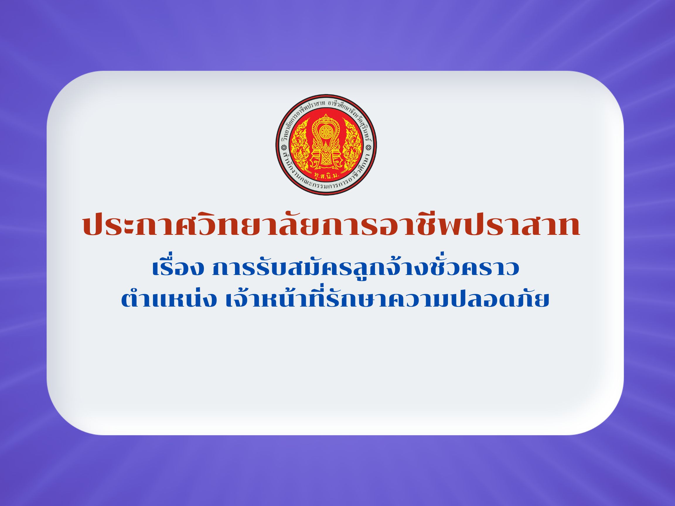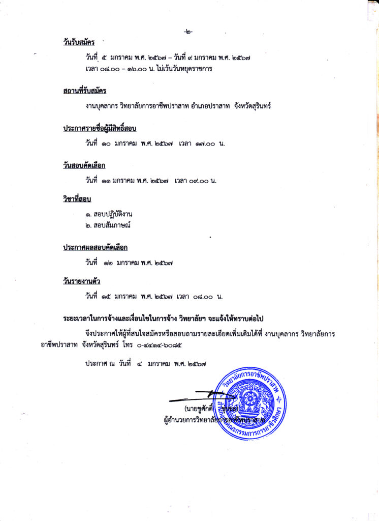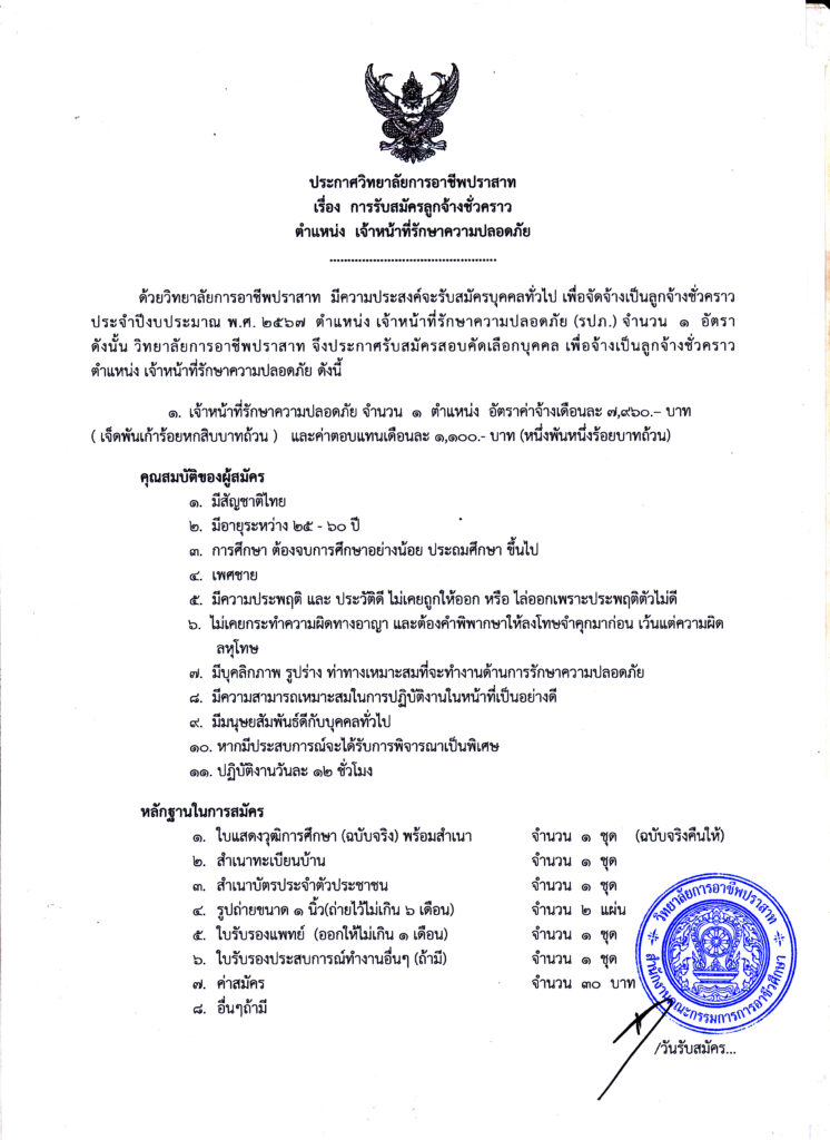 ข่าวประชาสัมพันธ์ข่าวสารและประกาศวิทยาลัยฯ ประกาศวิทยาลัยการอาชีพปราสาท เรื่อง การรับสมัครลูกจ้างชั่วคราว ตำแหน่ง เจ้าหน้าที่รักษาความปลอดภัย 05/01/2024 Sasiprapa Maiprom 533 Views