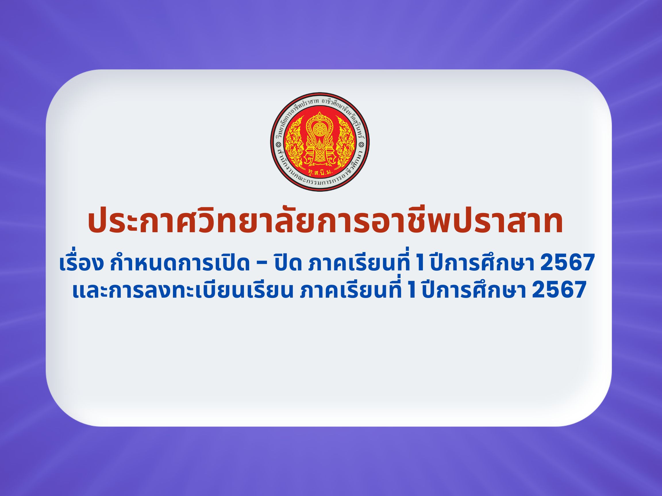 ข่าวประชาสัมพันธ์ข่าวสารและประกาศวิทยาลัยฯ ประกาศวิทยาลัยการอาชีพปราสาท เรื่อง กำหนดการเปิด – ปิด ภาคเรียนที่ 1 ปีการศึกษา 2567 และการลงทะเบียนเรียน ภาคเรียนที่ 1 ปีการศึกษา 2567 10/04/2024 Sasiprapa Maiprom 620 Views