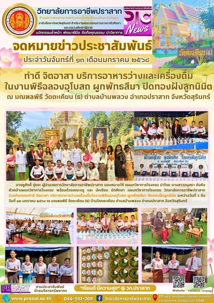 ายชูศักดิ์ ขุ่ยขะ ผู้อำนวยการวิทยาลัยการอาชีพปราสาท มอบหมายให้ แผนกวิชาการโรงแรม นำโดย นางสาวอนุสรา ตันหิง หัวหน้าแผนกวิชาการโรงแรม พร้อมด้วยคณะครู และ นักเรียน นักศึกษา แผนกวิชาการโรงแรมวิทยาลัยการอาชีพปราสาท ร่วมกิจกรรมทำดี จิตอาสา บริการอาหารว่างเครื่องดื่มในงานพิธีฉลองอุโบสถ ผูกพัทธสีมา ปิดทองฝั่งลูกนิมิต ระหว่างวันที่ ๖ ถึงวันที่ ๑๒ มกราคม ๒๕๖๘ ณ มณฑลพิธี วัดตะเคียน (ธ) บ้านโคกตะเคียน ตำบลบ้านพลวง อำเภอปราสาท จังหวัดสุรินทร์