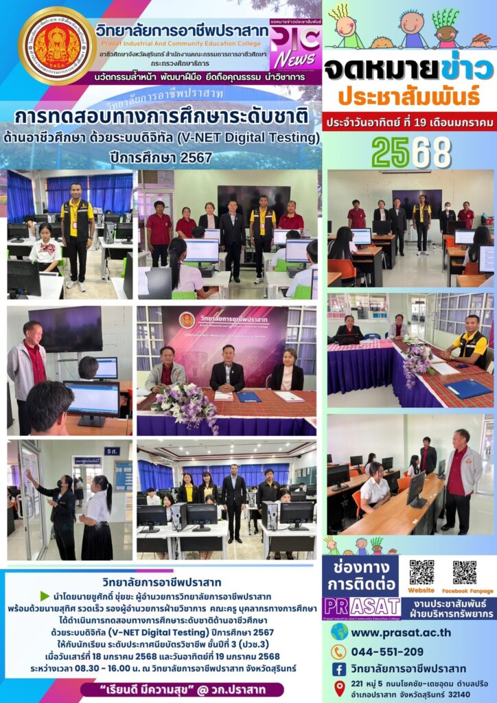 วิทยาลัยการอาชีพปราสาท นำโดยนายชูศักดิ์ ขุ่ยขะ ผู้อำนวยการวิทยาลัยการอาชีพปราสาท พร้อมด้วยนายสุทิศ รวดเร็ว รองผู้อำนวยการฝ่ายวิชาการ คณะครู บุคลากรทางการศึกษา ได้ดำเนินการทดสอบทางการศึกษาระดับชาติด้านอาชีวศึกษา ด้วยระบบดิจิทัล (V-NET Digital Testing) ปีการศึกษา 2567 ให้กับนักเรียน ระดับประกาศนียบัตรวิชาชีพ ชั้นปีที่ 3 (ปวช.3) เมื่อวันเสาร์ที่ 18 มกราคม 2568 และวันอาทิตย์ที่ 19 มกราคม 2568 ระหว่างเวลา 8.30 – 16.00 น. ณ วิทยาลัยการอาชีพปราสาท จังหวัดสุรินทร์