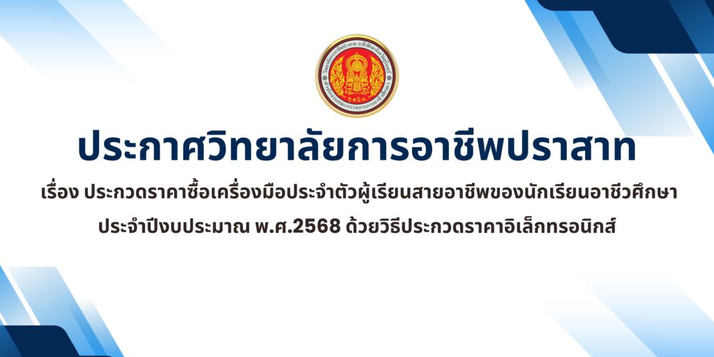 ข่าวสารและประกาศวิทยาลัยฯ ประกาศวิทยาลัยการอาชีพปราสาท เรื่อง ประกวดราคาซื้อเครื่องมือประจำตัวผู้เรียนสายอาชีพของนักเรียนอาชีวศึกษา 10/03/2025 Sasiprapa Maiprom 164 Views 0 Comments เอกสารประกวดราคาซื้อเครื่องมือประจำตัวผู้เรียนสายอาชีพของนักเรียนอาชีวศึกษา เอกสารประกวดราคาซื้อด้วยวิธีประกวดราคาอิเล็กทรอนิกส์ รายละเอียดคุณลักษณะเฉพาะเครื่องมือประจำตัวผู้เรียนเฉพาะอาชีพของนักเรียน