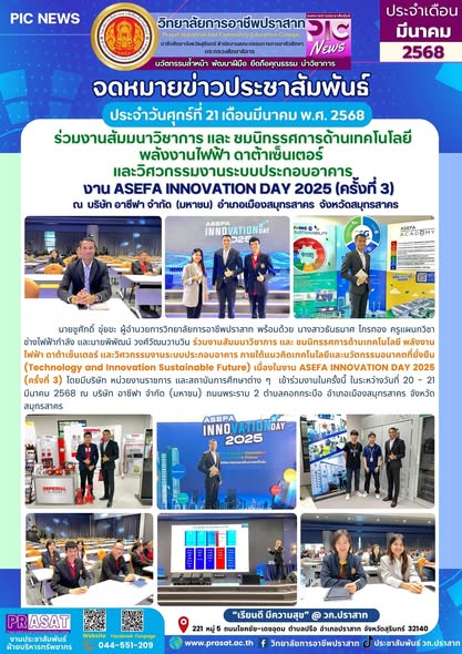 ภาพกิจกรรมร่วมกับชุมชน นิทรรศการด้านเทคโนโลยี พลังงานไฟฟ้า ดาต้าเซ็นเตอร์ และวิศวกรรมงานระบบประกอบอาคาร ภายใต้แนวคิดเทคโนโลยีและนวัตกรรมอนาคตที่ยั่งยืน (Technology and Innovation Sustainable Future) เนื่องในงาน ASEFA INNOVATION DAY 2025 (ครั้งที่ 3) 31/03/2025 Sasiprapa Maiprom 436 Views 0 Comments นิทรรศการด้านเทคโนโลยี พลังงานไฟฟ้า ดาต้าเซ็นเตอร์ และวิศวกรรมงานระบบ ประกอบอาคาร ภายใต้แนวคิดเทคโนโลยีและนวัตกรรมอนาคตที่ยั่งยืน นายชูศักดิ์ ขุ่ยขะ ผู้อำนวยการวิทยาลัยการอาชีพปราสาท พร้อมด้วย นางสาวธันธมาศ ไกรทอง ครูแผนกวิชาช่างไฟฟ้ากำลัง และนายพิพัฒน์ วงศ์วัฒนวานวิน ร่วมงานสัมมนาวิชาการ และ ชมนิทรรศการด้านเทคโนโลยี พลังงานไฟฟ้า ดาต้าเซ็นเตอร์ และวิศวกรรมงานระบบประกอบอาคาร ภายใต้แนวคิดเทคโนโลยีและนวัตกรรมอนาคตที่ยั่งยืน (Technology and Innovation Sustainable Future) เนื่องในงาน ASEFA INNOVATION DAY 2025 (ครั้งที่ 3) โดยมีบริษัท หน่วยงานราชการ และสถาบันการศึกษาต่าง ๆ เข้าร่วมงานในครั้งนี้ ในระหว่างวันที่ 20 – 21 มีนาคม 2568 ณ บริษัท อาซีฟา จำกัด (มหาชน) ถนนพระราม 2 ตำบลคอกกระบือ อำเภอเมืองสมุทรสาคร จังหวัดสมุทรสาคร