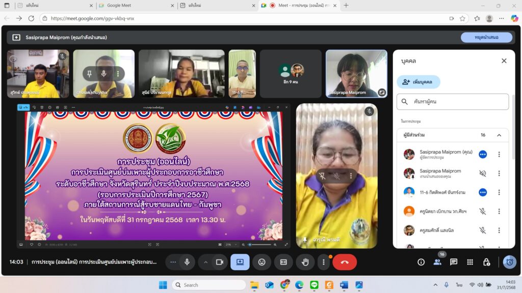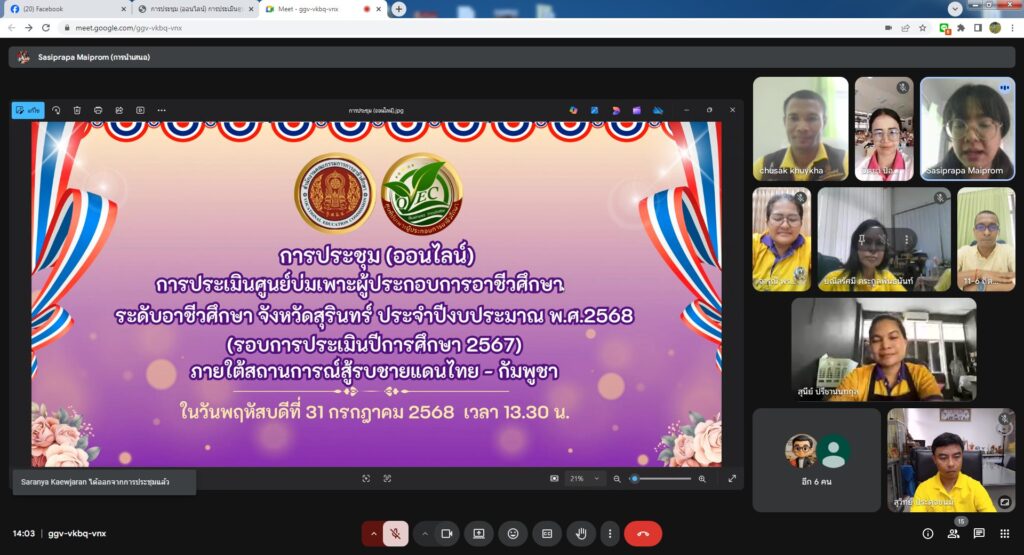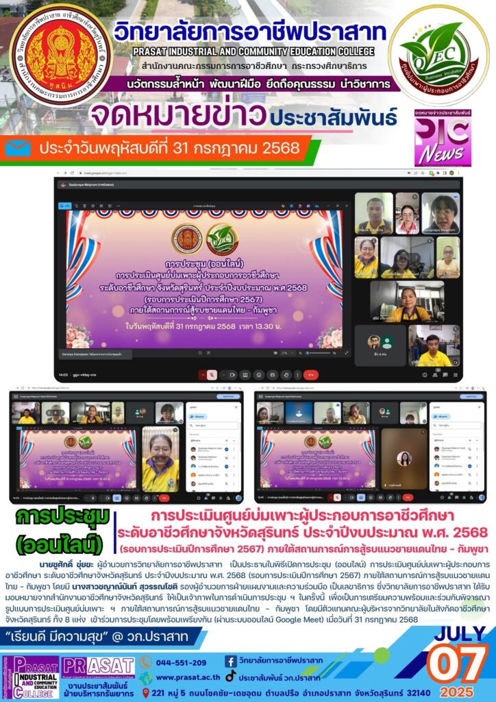 ภาพกิจกรรมภายในสถานศึกษา พิธีเปิดการประชุม (ออนไลน์) การประเมินศูนย์บ่มเพาะผู้ประกอบการอาชีวศึกษา ระดับอาชีวศึกษาจังหวัดสุรินทร์ ประจำปีงบประมาณ พ.ศ. 2568 (รอบการประเมินปีการศึกษา 2567) 25/08/2025 Sasiprapa Maiprom 237 Views 0 Comments การประชุม (ออนไลน์) การประเมินศูนย์บ่มเพาะผู้ประกอบการอาชีวศึกษา ระดับอาชีวศึกษาจังหวัดสุรินทร์ ประจำปีงบประมาณ พ.ศ. 2568 (รอบการประเมินปีการศึกษา 2567) นายชูศักดิ์ ขุ่ยขะ ผู้อำนวยการวิทยาลัยการอาชีพปราสาท เป็นประธานในพิธีเปิดการประชุม (ออนไลน์) การประเมินศูนย์บ่มเพาะผู้ประกอบการอาชีวศึกษา ระดับอาชีวศึกษาจังหวัดสุรินทร์ ประจำปีงบประมาณ พ.ศ. 2568 (รอบการประเมินปีการศึกษา 2567) ภายใต้สถานการณ์การสู้รบแนวชายแดนไทย – กัมพูชา โดยมี นางสาวชญาณ์นันท์ สุวรรณโชติ รองผู้อำนวยการฝ่ายแผนงานและความร่วมมือ เป็นเลขาธิการ ซึ่งวิทยาลัยการอาชีพปราสาท ได้รับมอบหมายจากสำนักงานอาชีวศึกษาจังหวัดสุรินทร์ ให้เป็นเจ้าภาพในการดำเนินการประชุม ฯ ในครั้งนี้ เพื่อเป็นการเตรียมความพร้อมและร่วมกันพิจารณารูปแบบการประเมินศูนย์บ่มเพาะ ฯ ภายใต้สถานการณ์การสู้รบแนวชายแดนไทย – กัมพูชา โดยมีตัวแทนคณะผู้บริหารจากวิทยาลัยในสังกัดอาชีวศึกษาจังหวัดสุรินทร์ ทั้ง 8 แห่ง เข้าร่วมการประชุมโดยพร้อมเพรียงกัน (ผ่านระบบออนไลน์ Google Meet) เมื่อวันที่ 31 กรกฎาคม 2568