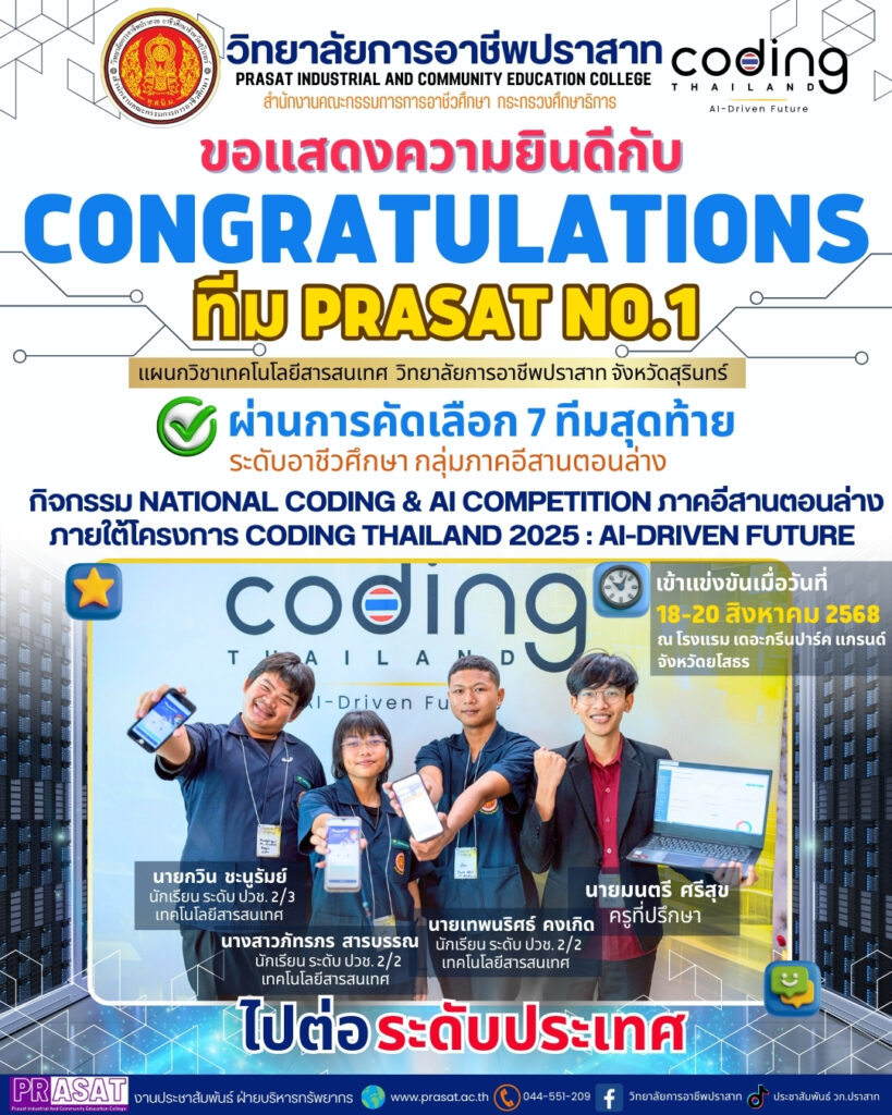 ข่าวประชาสัมพันธ์ กิจกรรม National Coding & AI Competition ภาคอีสานตอนล่าง ภายใต้โครงการ Coding Thailand 2025: AI-Driven Future #CodingThailand2025 11/09/2025 Sasiprapa Maiprom 50 Views 0 Comments