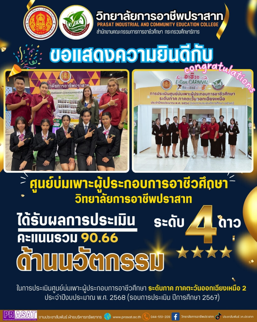 - การประเมินศูนย์บ่มเพาะฯ ระดับ ภาคตะวันออกเฉียงเหนือ 2568การประเมินศูนย์บ่มเพาะผู้ประกอบการอาชีวศึกษา ระดับภาค ภาคตะวันออกเฉียงเหนือ ประจำปีงบประมาณ พ.ศ. 2568 (รอบการประเมินปีการศึกษา 2567 )