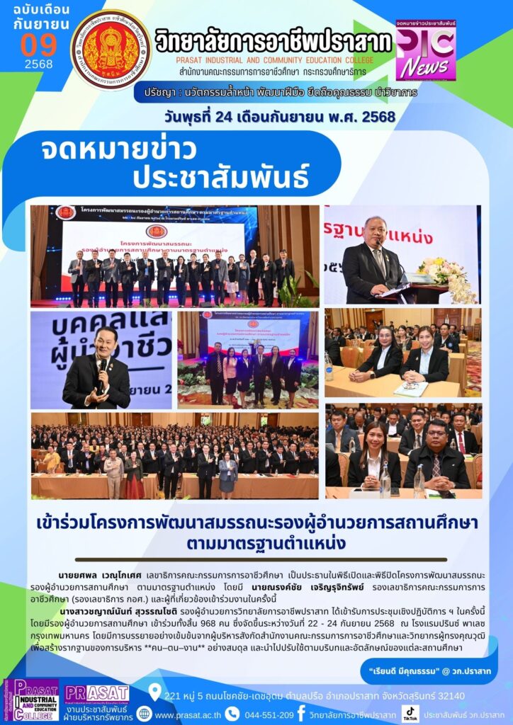 ภาพกิจกรรมร่วมกับชุมชน พิธีเปิดและพิธีปิดโครงการพัฒนาสมรรถนะ รองผู้อำนวยการสถานศึกษา ตามมาตรฐานตำแหน่ง 03/10/2025 Sasiprapa Maiprom 21 Views 0 Comments พิธีเปิดและพิธีปิดโครงการพัฒนาสมรรถนะ รองผู้อำนวยการสถานศึกษา ตามมาตรฐานตำแหน่ง นางสาวชญาณ์นันท์ สุวรรณโชติ รองผู้อำนวยการวิทยาลัยการอาชีพปราสาท ได้เข้ารับการประชุมเชิงปฏิบัติการ ฯ ในครั้งนี้ โดยมีรองผู้อำนวยการสถานศึกษา เข้าร่วมทั้งสิ้น 968 คน ซึ่งจัดขึ้นระหว่างวันที่ 22 – 24 กันยายน 2568 ณ โรงแรมปรินซ์ พาเลซ กรุงเทพมหานคร โดยมีการบรรยายอย่างเข้มข้นจากผู้บริหารสังกัดสำนักงานคณะกรรมการการอาชีวศึกษาและวิทยากรผู้ทรงคุณวุฒิ เพื่อสร้างรากฐานของการบริหาร **คน–ตน–งาน** อย่างสมดุล และนำไปปรับใช้ตามบริบทและอัตลักษณ์ของแต่ละสถานศึกษา